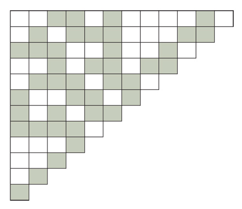 Закрашивание того или иного квадратика происходит в случае, если из двух квадратиков — расположенного непосредственно над ним и расположенного правее и выше — закрашен только один.