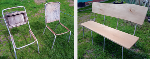 Два сломанных дачных стула можно объединить двумя обрезками досок — получится удобная трёхместная скамейка.