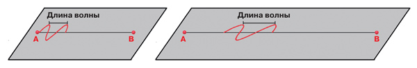Художественное изображение распространения волны между пунктами A и B на растягивающейся резиновой ленте. На левом рисунке показана ситуация в момент излучения, на правом — в некоторый момент времени. Из-за растяжения ленты возросли расстояние AB и длина волны. Первое увеличивает время распространения, а второе смещает световую волну в красную часть спектра.