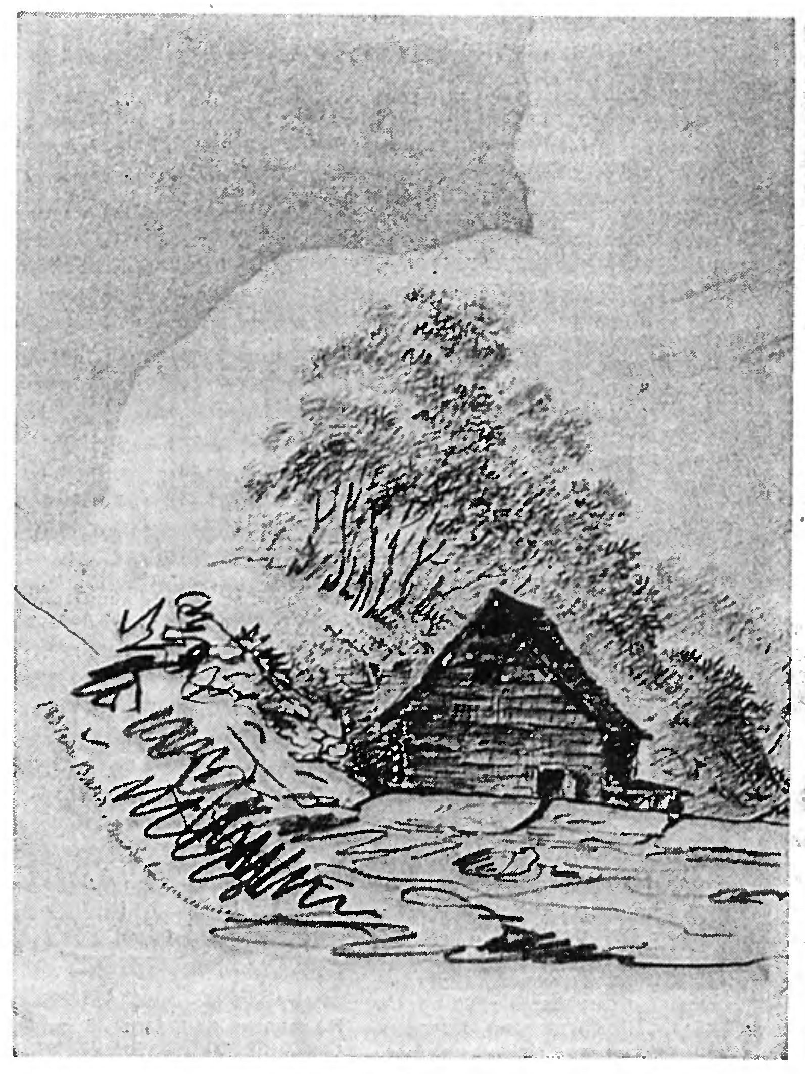 Место, выбранное для рисунка, привлекло поэта своей романтичностью. Ущелье с текущей речкой, и мельница - в чаще покрывающего склоны леса, на дальнем плане тонущие во мгле горы. Слева надпись, включенная в конфигурацию рисунка «13 майя 1837 г. Волобуева мельница». Но где находилась Волобуева мельница? В летописи жизни, и деятельности М. Ю. Лермонтова находим, что вскоре после появления его стихов «На смерть поэта» возникло жандармское «Дело о непозволительных стихах.»