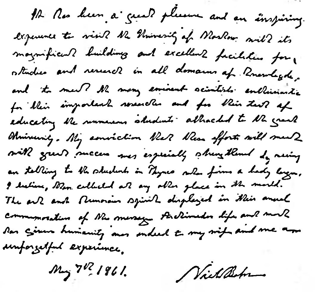 Для меня было большим наслаждением, и вдохновляющим переживанием посетить величественные здания Московского университета; познакомиться с превосходными условиями, созданными в его стенах для обучения и исследований во всех сферах знания; встретиться со многими прославленными учеными, которые с энтузиазмом отдают свои силы, и важным научным изысканиям и делу воспитания бесчисленных студентов этого великого университета. Моя убежденность, что эти усилия будут вознаграждены громадными успехами, особенно окрепла после общения со студентами-физиками, чей единый коллектив, я полагаю, не имеет себе равных нигде в мире. Артистизм, и чувство юмора, проявившиеся в их ежегодном празднестве в честь Архимеда и его заслуг перед человечеством, произвели на мою жену, и на меня действительно неизгладимое впечатление.