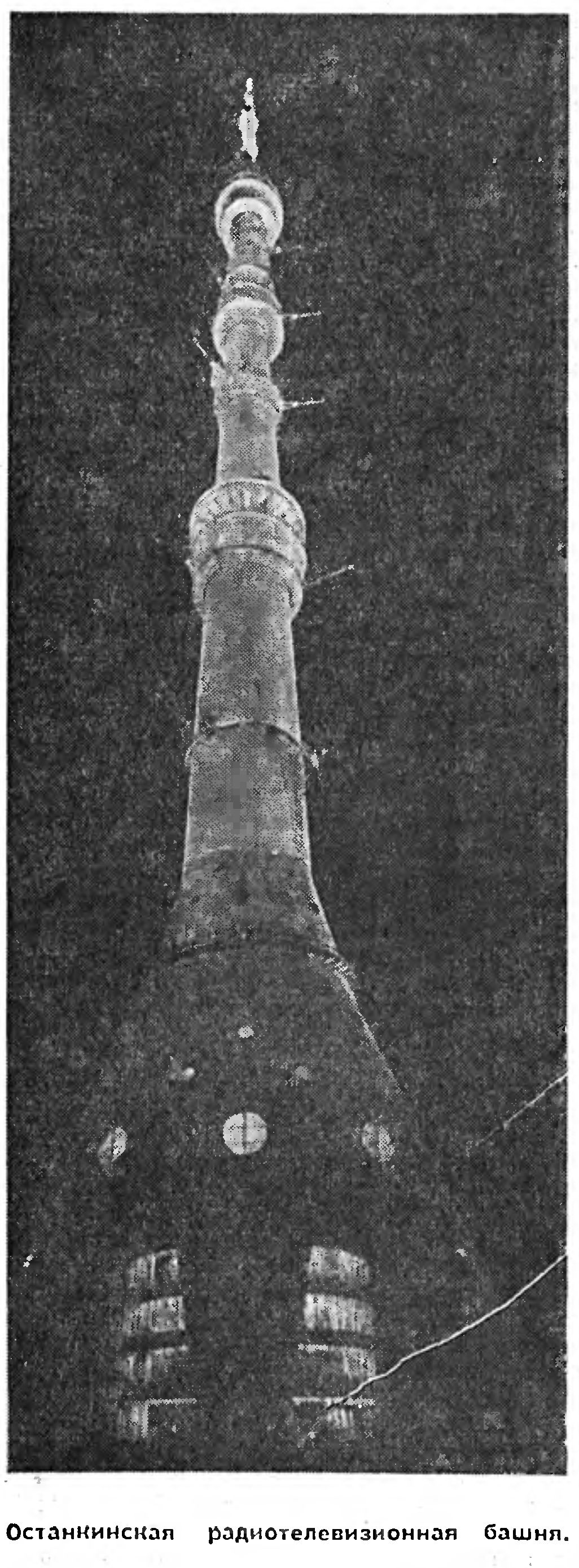 Многочисленные антенны четырех телевизионных программ, радиовещания на УКВ по шести программам, радиорелейные антенны, связывающие Москву со всем миром, - это, как бы прожектора незримого радио излучения, заливающие радиоволнами грандиозное поле. Если башня будет слишком шибко раскачиваться, то радиолучи начнут бегать по Земле и вносить непорядки в передачу, особенно на краю поля. Башня должна быть жесткой, и упругой.