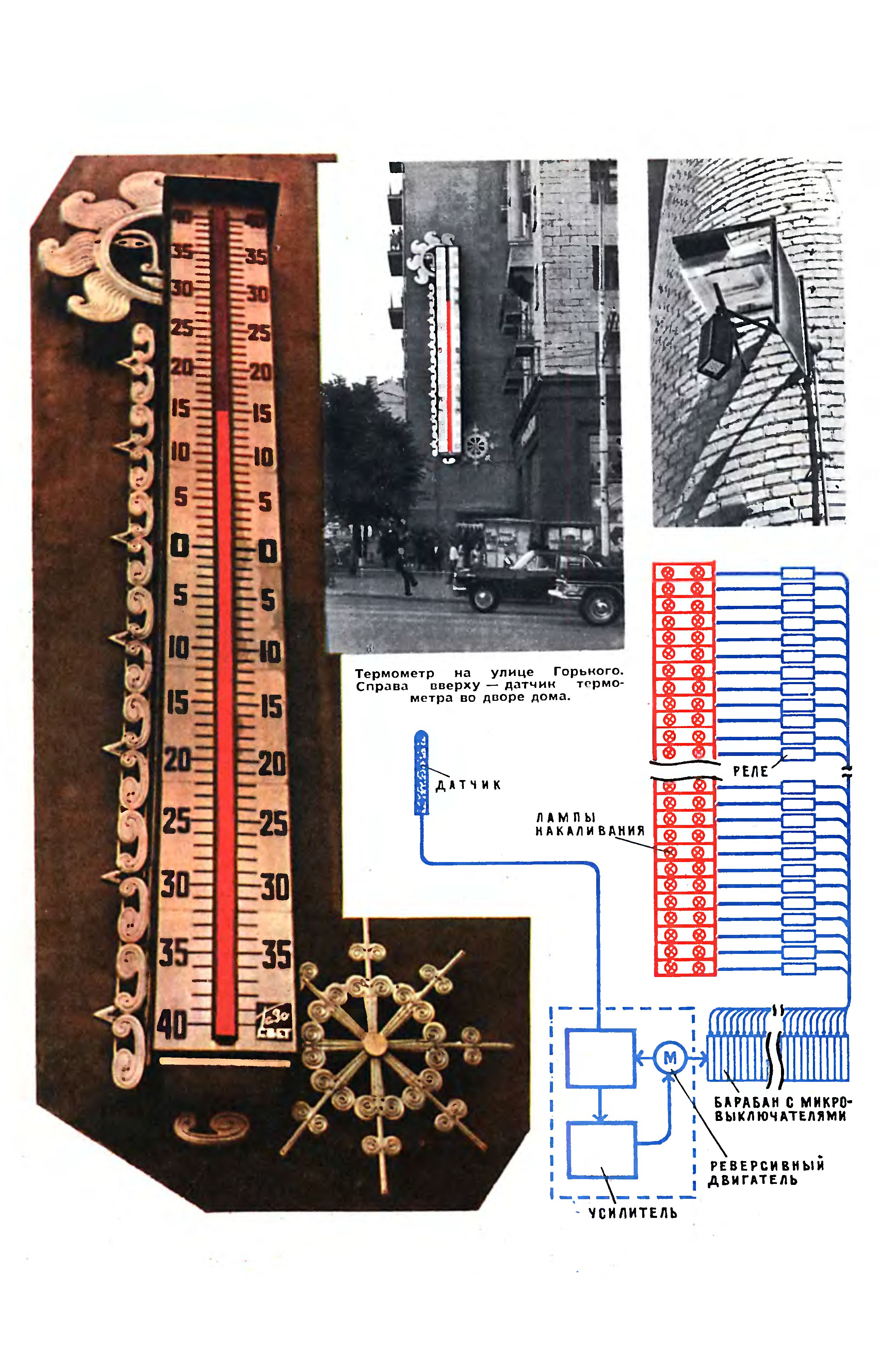 Как известно, существующие приборы для измерения температуры имеют шкалу ограниченных размеров. Чтобы передавать показания термометра на шкалу, которую можно наблюдать с расстояния в несколько десятков метров, было разработано специальное дистанционное устройство.