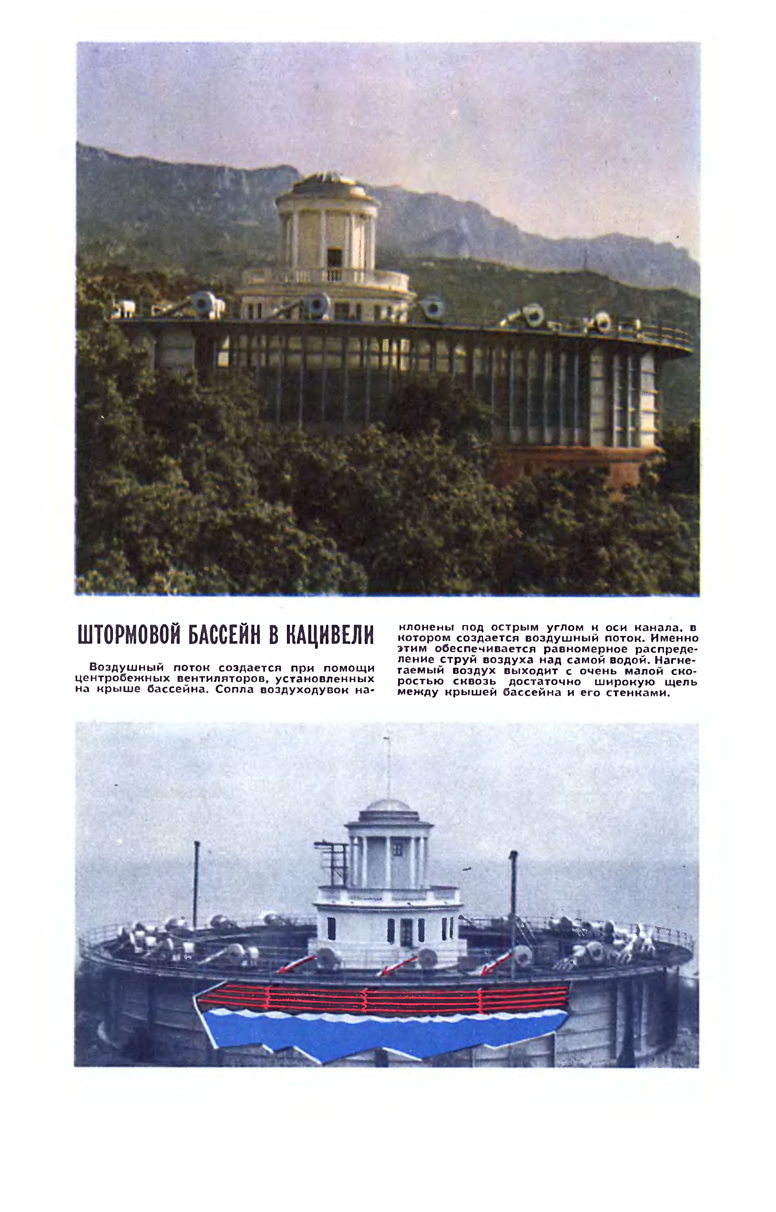 Немедленно после окончания Отечествен пой войны бассейн спроектировали в натуральных размерах, и он вошел в эксплуатацию в 1953 году. На цветной вкладке - внешний вид этого бассейна в Экспериментальном отделении Морского гидрофизического института АН УССР в Кацивели, в Крыму. Здесь же, на цветной вкладке, - вид на бассейн сверху, и схема, поясняющая устройство дутья.