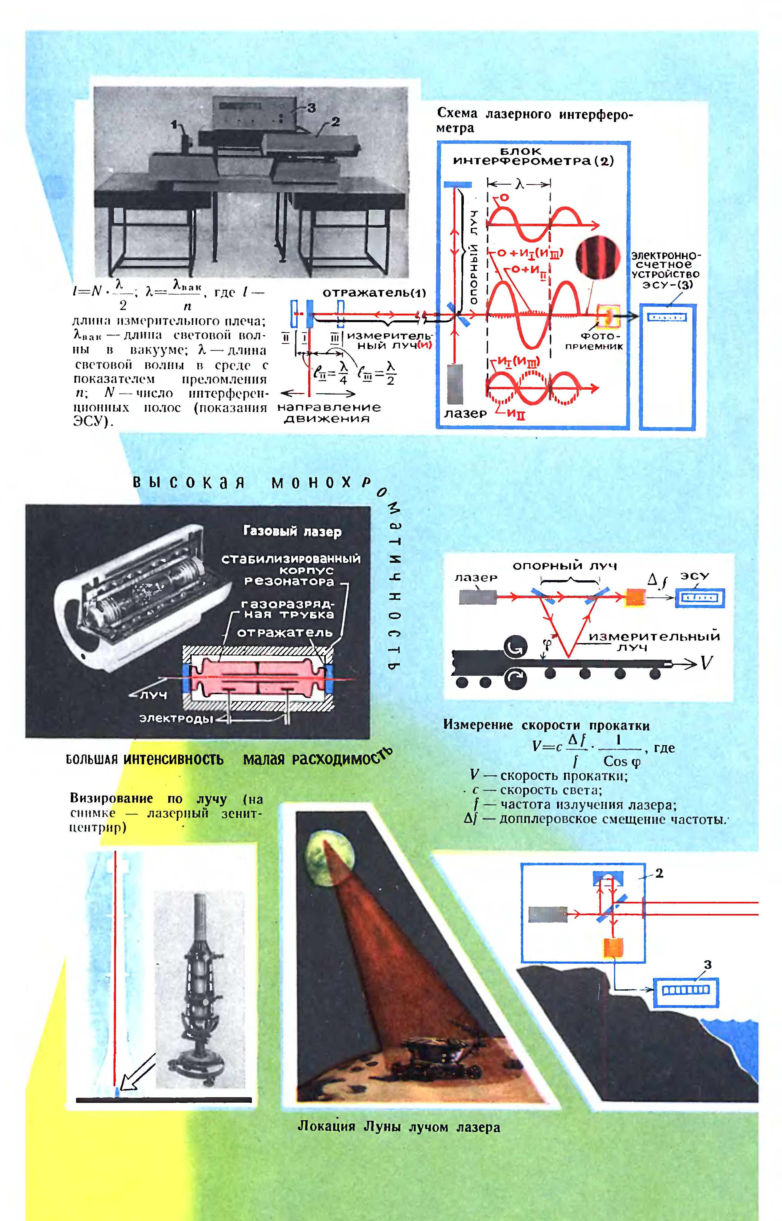 Лазерные интерферометры с диапазоном измерения до 200 мм уже используются в микроэлектронике при изготовлении интегральных схем. Для нанесения элементов интегральной схемы необходимо производить их покадровое проекционное впечатывание на подложку. При этом каждый следующий кадр должен впечатываться после перемещения подложки на строго определенную величину. От томности перемещения зависит совмещение элементов, а также максимальный размер подложки. С использованием двух координатного лазерного интерферометра (его принципиальная схема показана на цветной вкладке; для упрощения там не изображено устройство, с помощью которого осуществляют технологический процесс) удалось примерно в 10 раз точнее, чем раньше, контролировать перемещение столика с подложкой. Это позволило увеличить плотность упаковки элементов интегральных схем, и перейти к изготовлению больших интегральных схем (БИС), необходимых для создания сверхминиатюрной радиоэлектронной аппаратуры, для превращения многих ныне еще уникальных изделий в товары широкого потребления. Внедрение лазерной интерферометрии поможет сделать, например, электронные вычислительные машины типа БЭСМ, занимающие сегодня несколько комнат, неотъемлемой частью письменного стола ученых.
