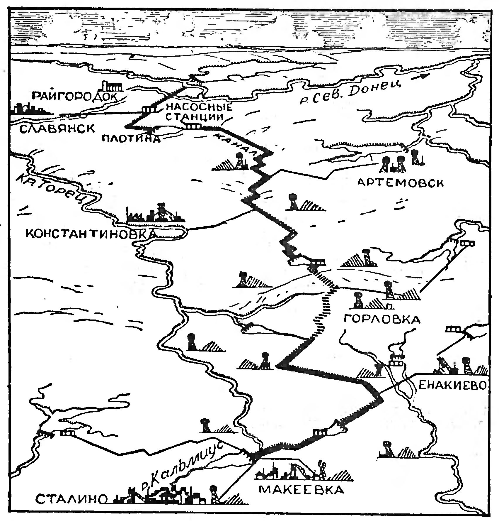 Советское правительство наметило осуществить в ближайшие годы широкую программу гидротехнических работ в Донецком бассейне. Претворение в жизнь этой программы позволит разрешить водную проблему путем использования ресурсов Северного Донца. К 1958 году будет сооружен канал. Северный Донецк-Донбасс протяженностью в 125 километров и пропускной способностью около 2 миллионов кубических метров воды в сутки. Это позволит полностью урегулировать водоснабжение крупнейших промышленных районов Донбасса - Краматорского, Константиновского, Дружковского, Горловского, Артемовского, Сталинского, Славянского, Енакиевского и Макеевского, а также оросить значительную часть колхозных и совхозных полей. Намного расширятся поливные площади, резко увеличится производство овощей и картофеля, откроются новые возможности для развития животноводства. В глубинных степных районах возникнут орошаемые фруктовые сады, бахчи, ягодные плантации. Канал сделается естественным курортно-оздоровительным центром. Пройдет немного времени -, и на его берегах, и многочисленных озелененных водохранилищах возникнут благоустроенные дома отдыха для горняков и шахтеров Донецкого края. Канал, воды которого пойдут в реки Донбасса Казенный Торец, Крынку, Кальмиус, Грузскую - будет иметь также важное значение для обводнения и санитарного оздоровления рек.