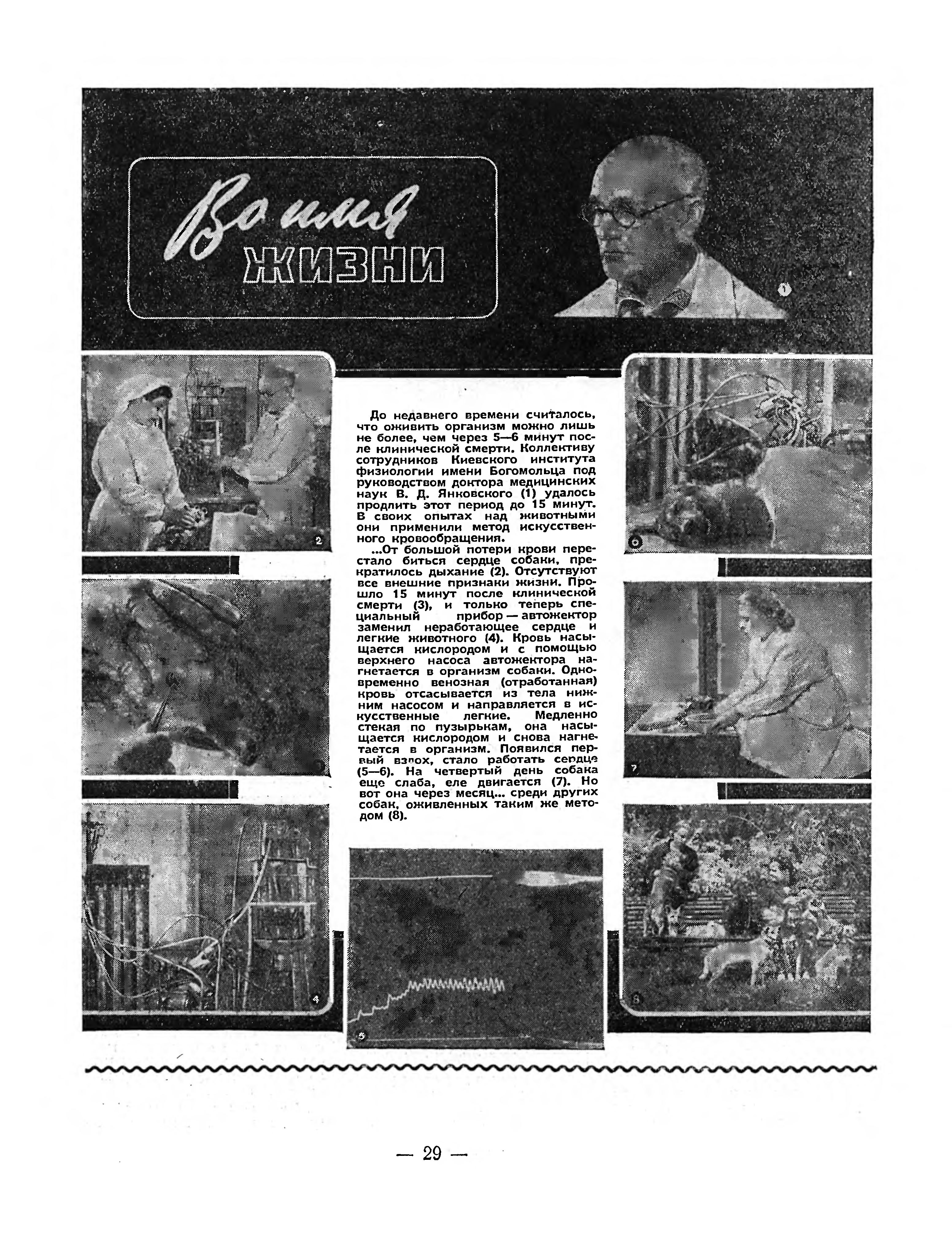 ...От большой потери крови перестало биться сердце собаки, прекратилось дыхание (2). Отсутствуют все внешние признаки жизни. Прошло 15 минут после клинической смерти (3), и только теперь специальный прибор - автожектор заменил неработающее сердце и легкие животного (4). Кровь насыщается кислородом и с помощью верхнего насоса автожектора нагнетается в организм собаки. Одновременно венозная (отработанная) кровь отсасывается из тела нижним насосом и направляется в искусственные легкие. Медленно стекая по пузырькам, она насыщается кислородом и снова нагнетается в организм. Появился первый вздох, стало работать сердце (5-6). На четвертый день собака еще слаба, еле двигается (7). Но вот она через месяц. среди других собак, оживленных таким же методом (8).