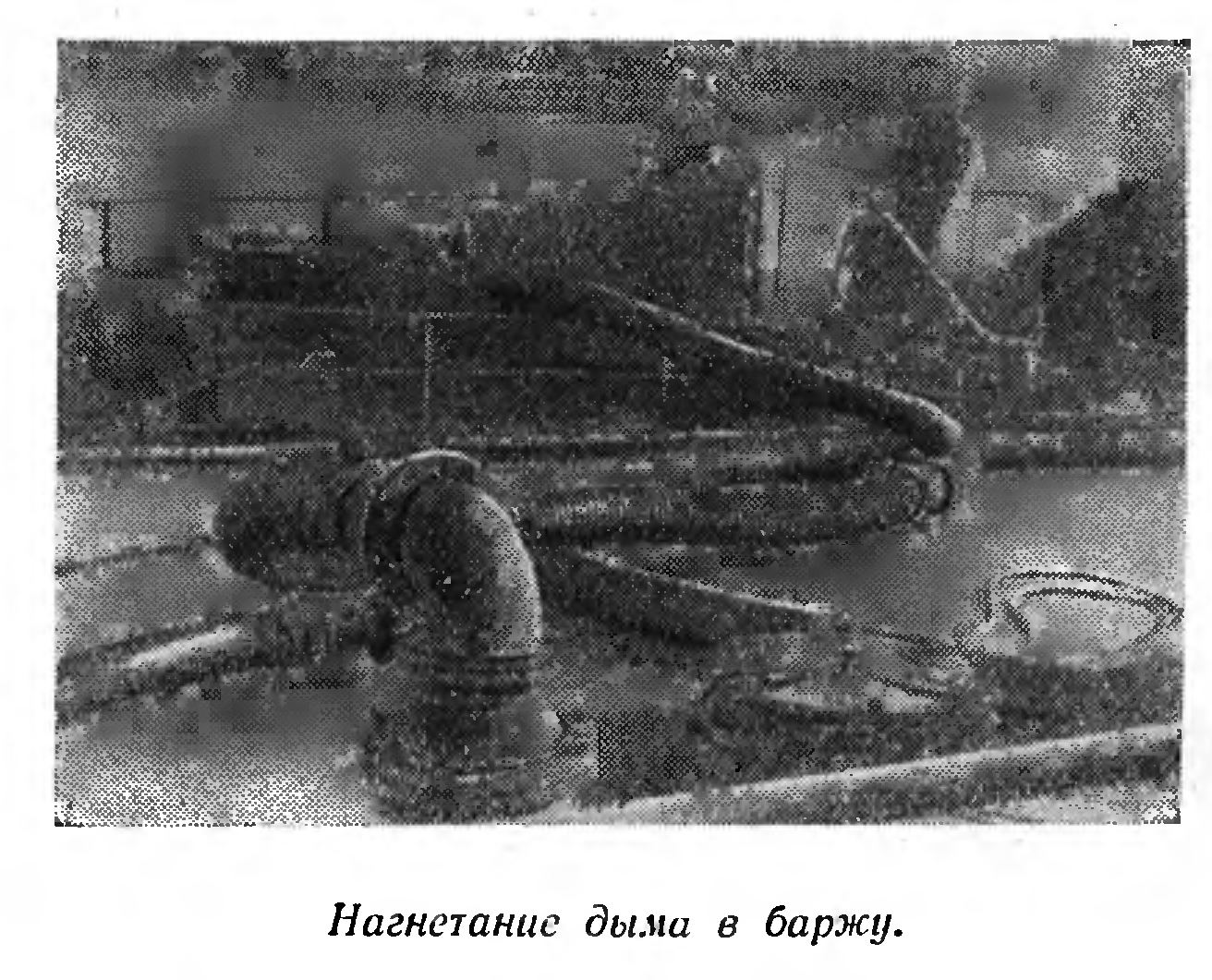 ...К поврежденной барже подходит баркас, на котором оборудована установка для нагнетания дыма. Получаемый в топке баркаса дым отводится от трубы и попадает в камеру охлаждения. Здесь температура его снижается и он очищается от раскаленных частиц топлива. Затем вентиляторы накачивают дым в подпалубное пространство баржи. Если пролом очень велик - его закрывают кошмой или брезентом. После такой подготовки можно производить электросварку поврежденного участка. Струя огня режет и плавит металл, но теперь это не представляет никакой-опасности.