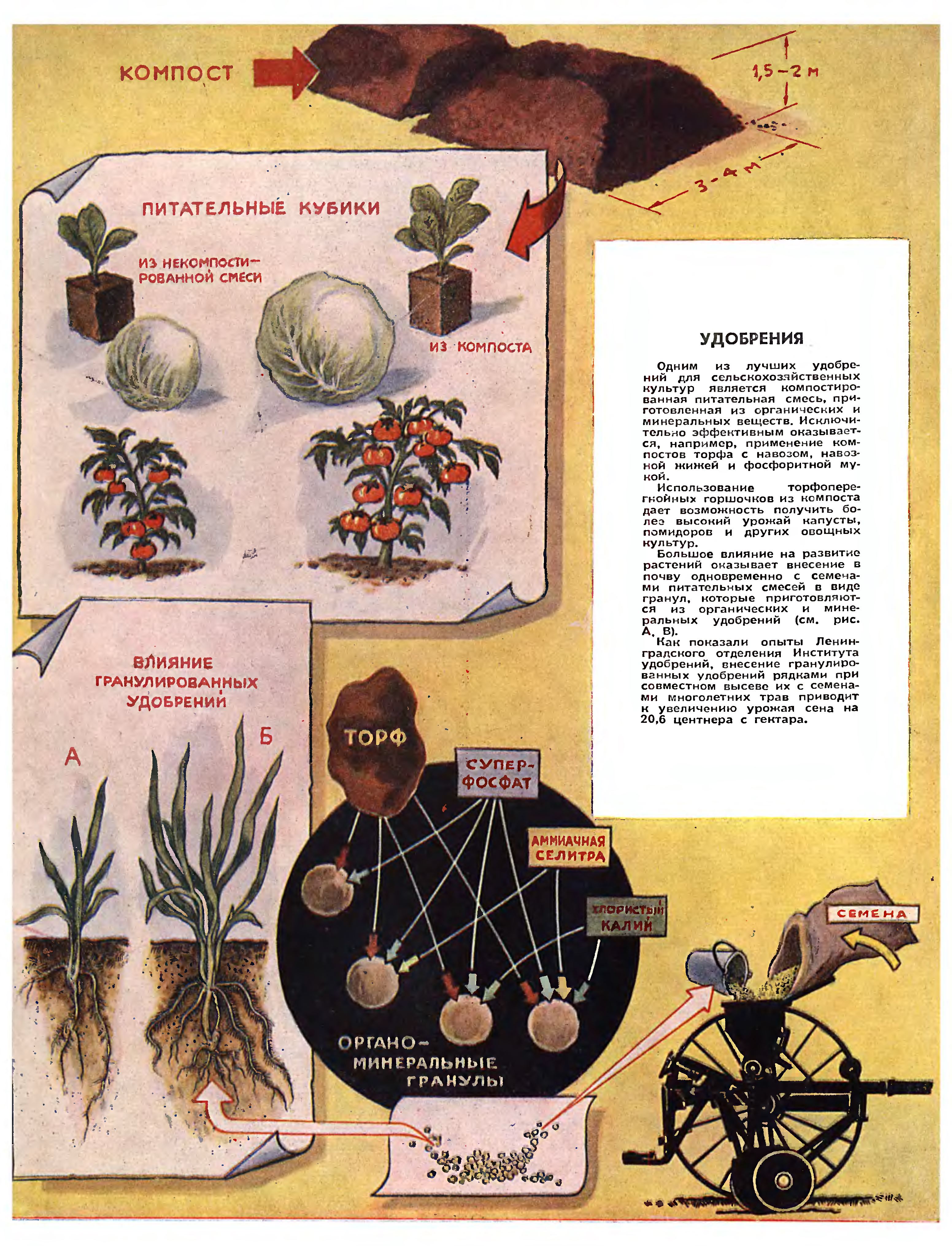 НАУКА и практика сельского хозяйства доказали необходимость широкого применения удобрений для получения высоких урожаев. Поэтому в нашей стране придается огромное значение производству искусственных удобрений. К 1964 году наша промышленность будет производить до 30 миллионов тонн различных минеральных удобрений, то есть в три раза больше, чем -в 1940 году.