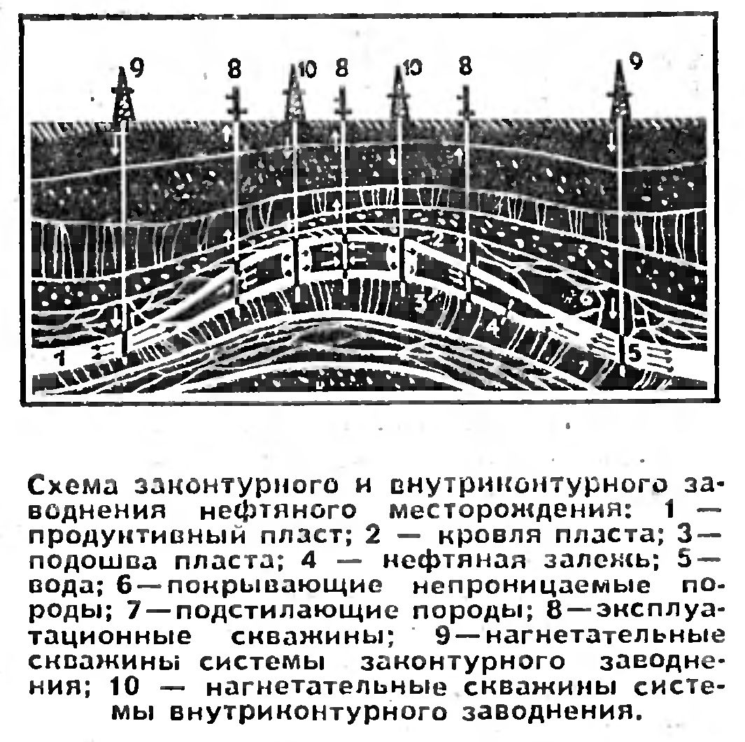 В продуктивный пласт через нагнетательные скважины закачивают воду в объеме, равном (или большем) объему извлекаемой нефти. В результате пластовая энергия в залежи сохраняется на оптимальном уровне. Срок фонтанирования скважин удлиняется (такой способ добычи - самый экономичный), что позволяет значительно сократить объем буровых работ и снизить себестоимость нефти.