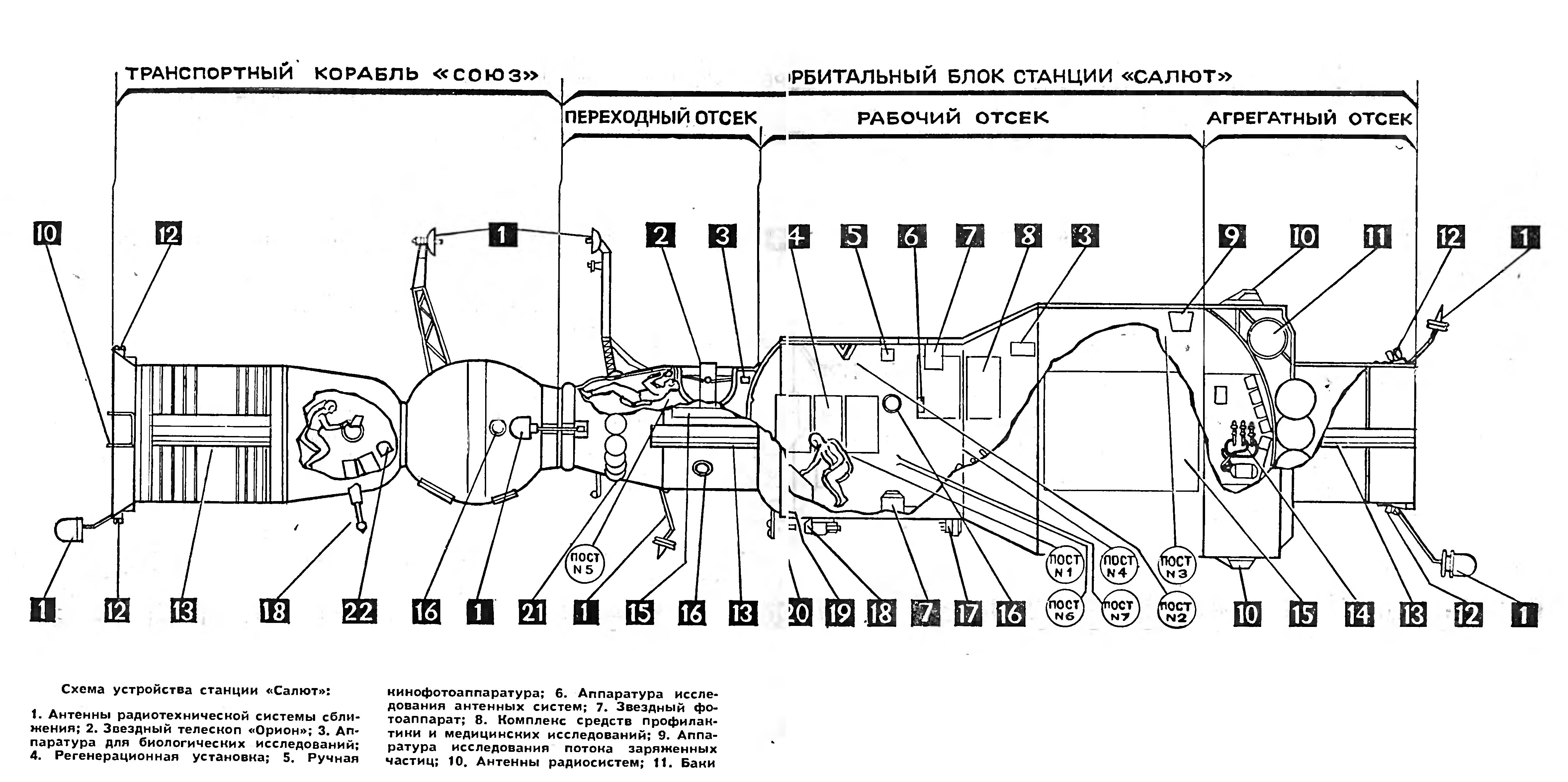 Конструкторы станции сумели создать для ее экипажа просторные жилые помещения, удобные посты для ведения научной работы, и управления станцией. Всего таких постов семь. Пост № 1 - центральный пост управления станцией; посты № 2, и № 6 служат для проведения ручной астроориентации, и астронавигации станции; посты № 3, и № 7, откуда ведется управление научной аппаратурой; пост № 4 - управление научной аппаратурой, и медицинские исследования; пост № 5 - управление звездным телескопом «Орион»