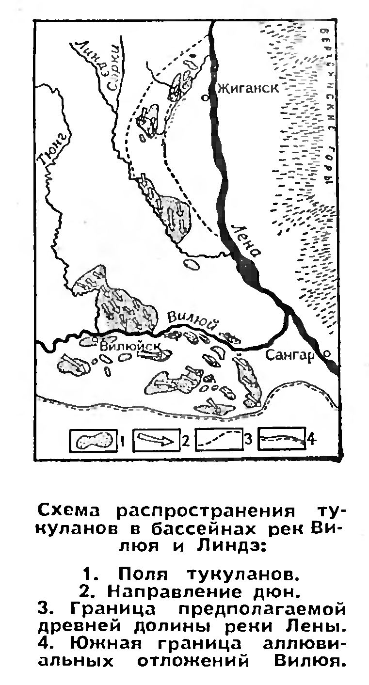 С тех пор, как в Якутской тайге, в бассейне Вилюя, были открыты алмазы, Якутия стала особенно популярной. О ней много пишут, рассказывают. Но все же, вероятно, не многие знают о том, что в бассейне реки Вилюя, среди тайги, расположены большие поля развеваемых песков - тукуланов. «Тукулан» - якутское слово, вошедшее в научную литературу для обозначения удивительного природного явления, живо напоминающего настоящие пустыни Средней Азии. Видимо, недаром один из пионеров научного изучения Якутии, С. Кузнецов, еще в 1927 году назвал свою статью о тукуланах так «Барханная область в Якутском крае»