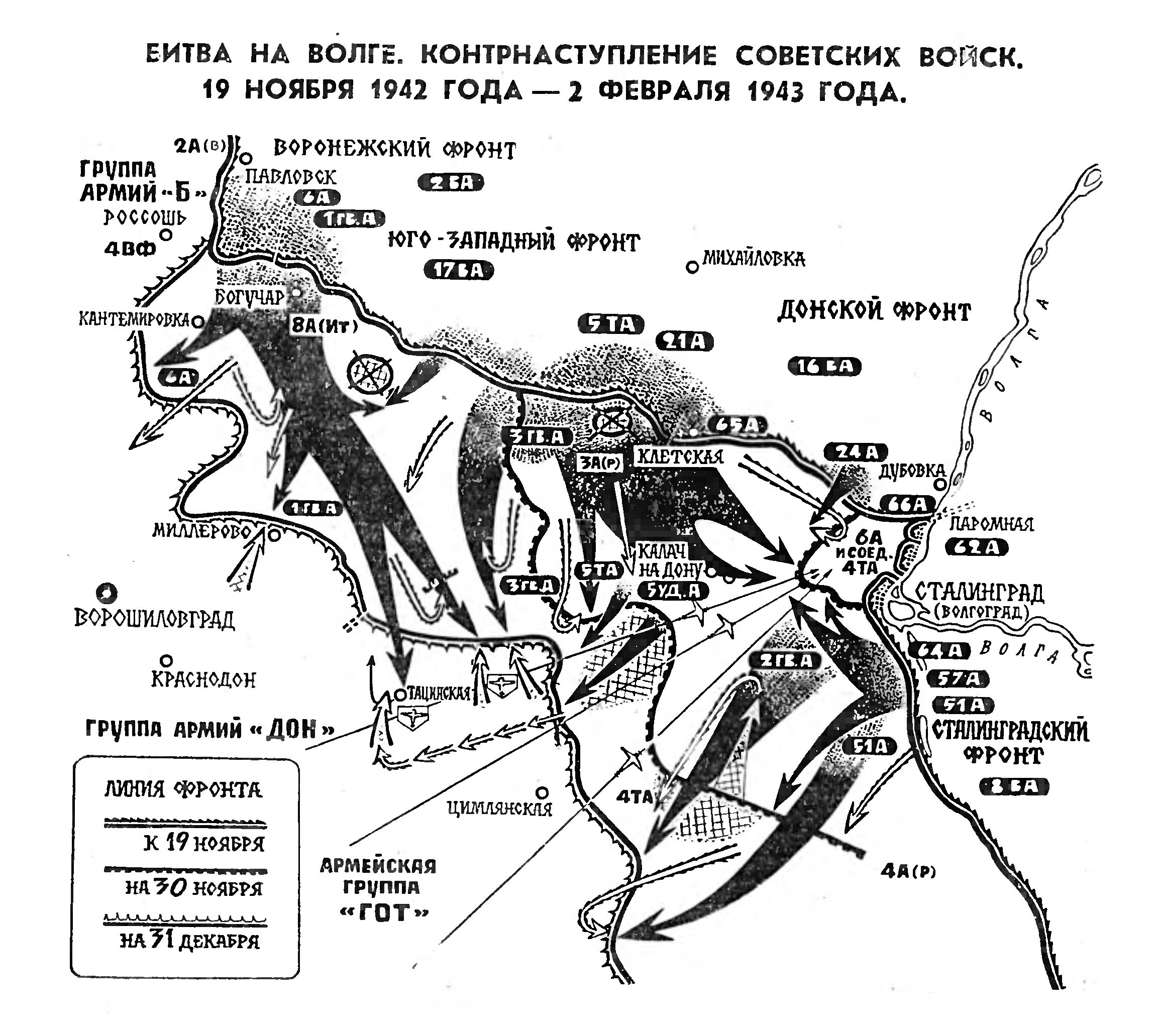 При выборе направления главного удара преимущество отдавалось также тем участкам, где у противника оборонялись менее боеспособные войска, а наше оперативное положение, и начертание линии фронта способствовали быстрому рассечению группировки противника, окружению или разгрому ее по частям, как это имело место, например, в Сталинградской операции. Одной из характерных особенностей этой операции, как известно, являлось умелое выявление уязвимых мест во вражеской обороне, нанесение мощных внезапных ударов с целью окружения противника.