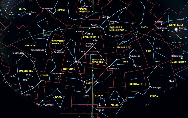 Юпитер весну проведёт в созвездии Близнецы. После январского противостояния у него хорошая вечерняя видимость. 11 марта у гиганта стояние с возвращением к прямому движению. Уран всю весну будет находиться в Тельце, недалеко от Плеяд. 22 мая у него наступит соединение с Солнцем.