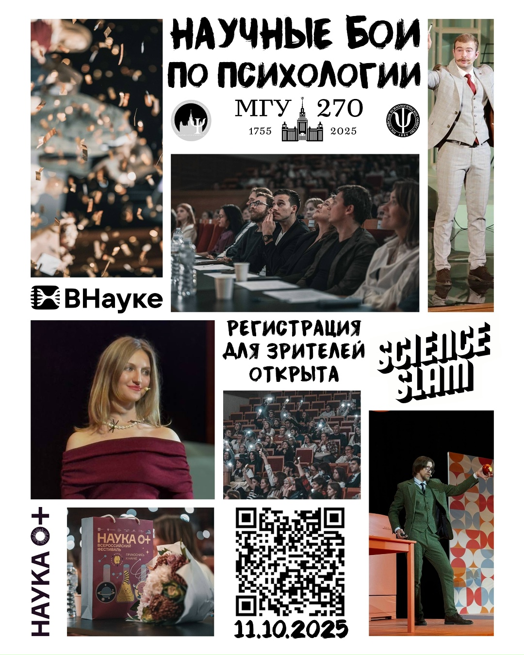 11 октября в 19:00 в рамках Фестиваля НАУКА 0+ пройдут Всероссийские студенческие Научные бои по психологии, организованные факультетом психологии МГУ имени М.В. Ломоносова. На сцене будут представлены разные вузы, разные города России и, конечно же разные темы психологических исследований. Ждем вас в главном зале Фундаментальной библиотеки МГУ – приходите сами и зовите друзей.