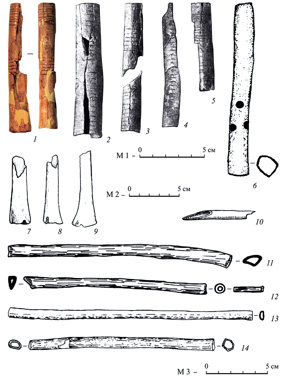 Костяные изделия из могильников Доно-Волжского региона. Могильники: 1 – Екатериновский мыс; 2–5, 10 – Мариупольский; 6–9 – Хлопков бугор; 11–13 – Хвалынский I; 14 – Ворошиловград. Изображения (здесь и далее): Скоробогатов А.М., Килейников В.В. // КСИА.