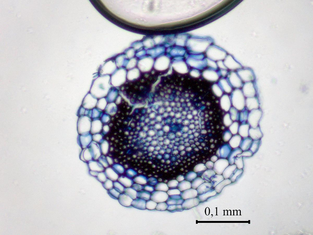 На срезе стебля сфагнового мха хорошо видны отличающиеся по толщине стенки и объему клеток ткани_механическая(склеродермис) и удерживающая воду (гиалодермис). Фото Елены Чураковой.