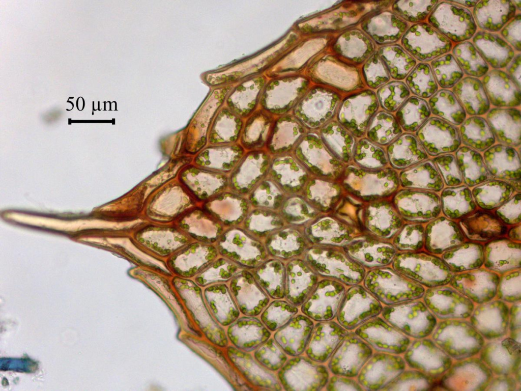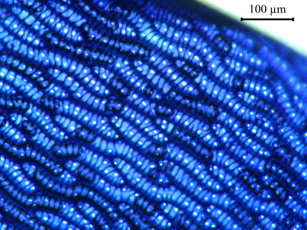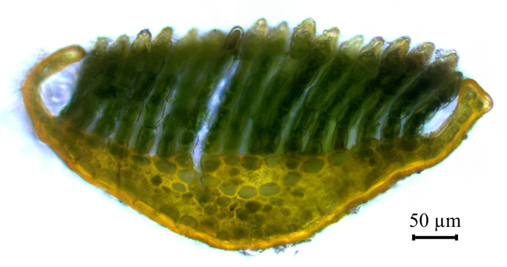 На срезе листа Polytrichum alpinum видны плотно прижатые друг к другу пластинки, толщиной в одну клетку, которые помогают удерживать воду в листьях благодаря силам капиллярного натяжения. Фото Елены Чураковой.
